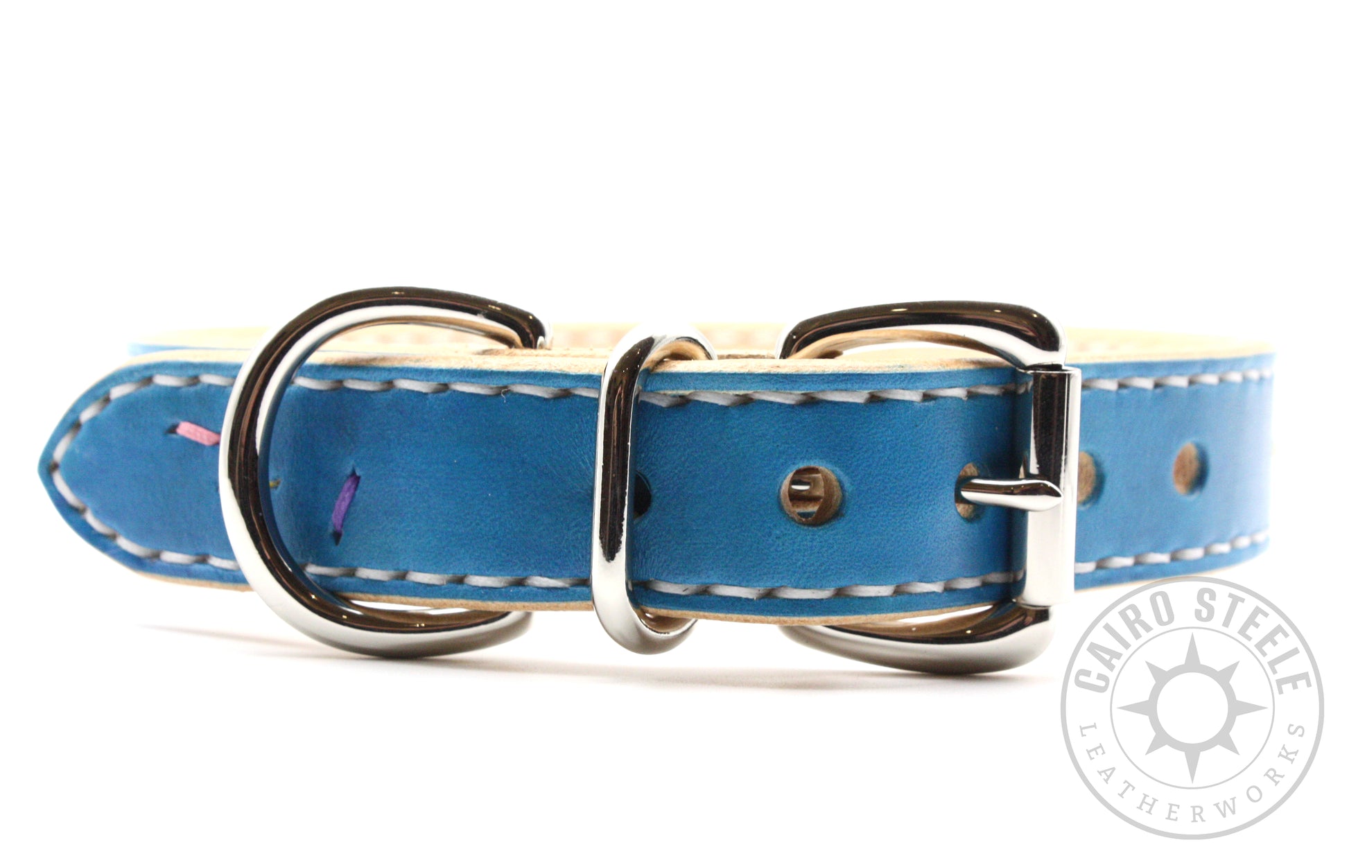 A new batch of sugar cookie collars has hit the shop, fresh from the oven! This delicious collar features an aqua exterior with rainbow embroidered "sprinkles," a natural tan interior, and tan edges. It has white stitching all around the border and nickel plated brass hardware.