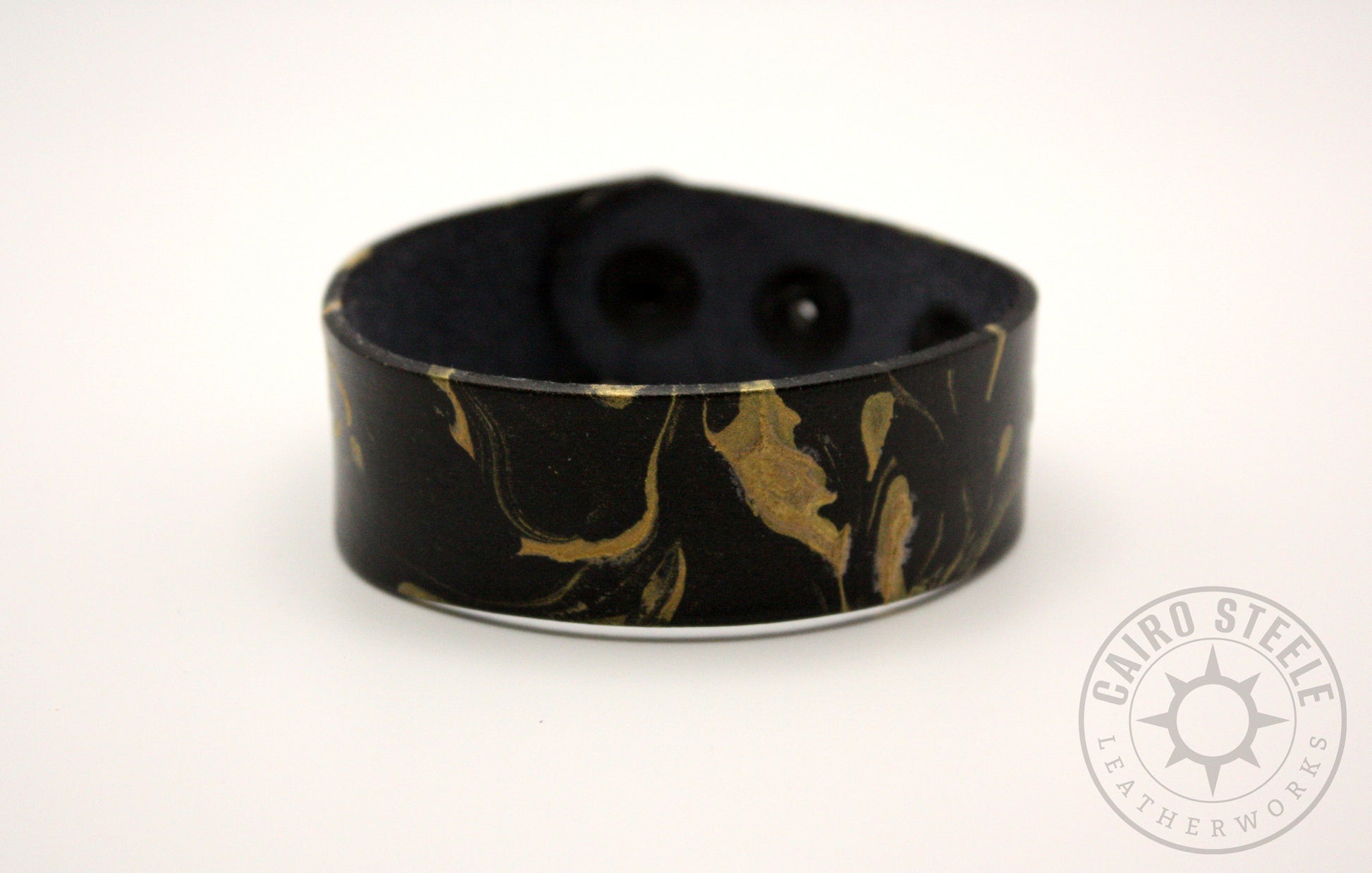 This leather bracelet features a black leather strap marbled with swirls of metallic gold, and closes with sturdy black snaps. It is cut, dyed, and assembled completely by hand. It is adjustable from approximately 5.5" - 7"