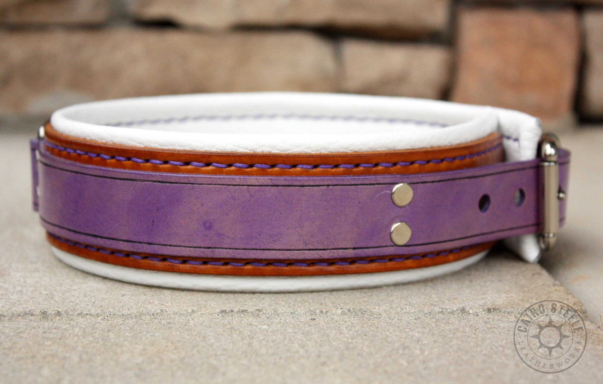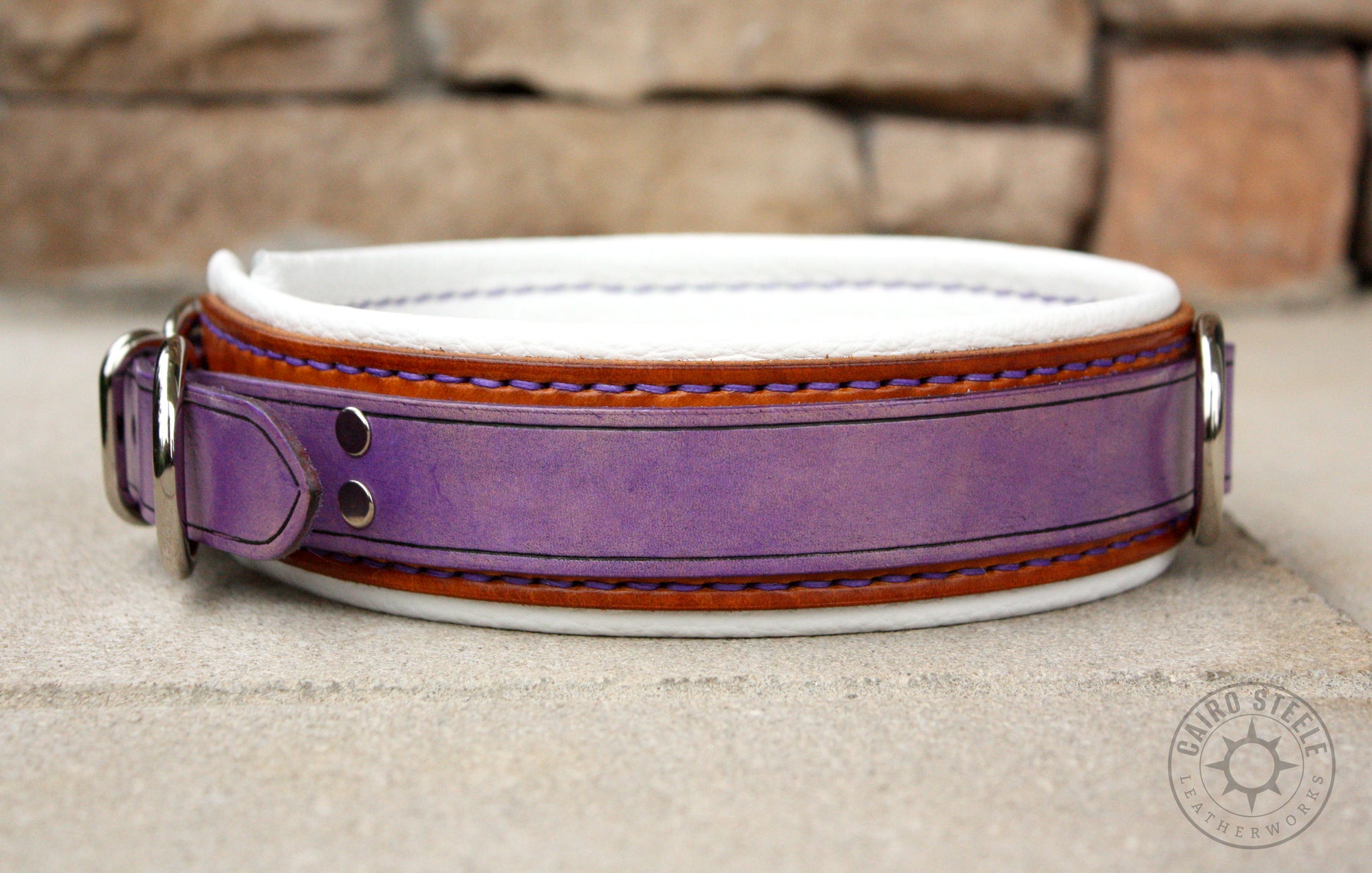 This sweet collar is reminiscent of blackberry cobbler, with a bright purple top strap over a tan base strap and white liner, with purple stitching and nickel plated brass hardware.