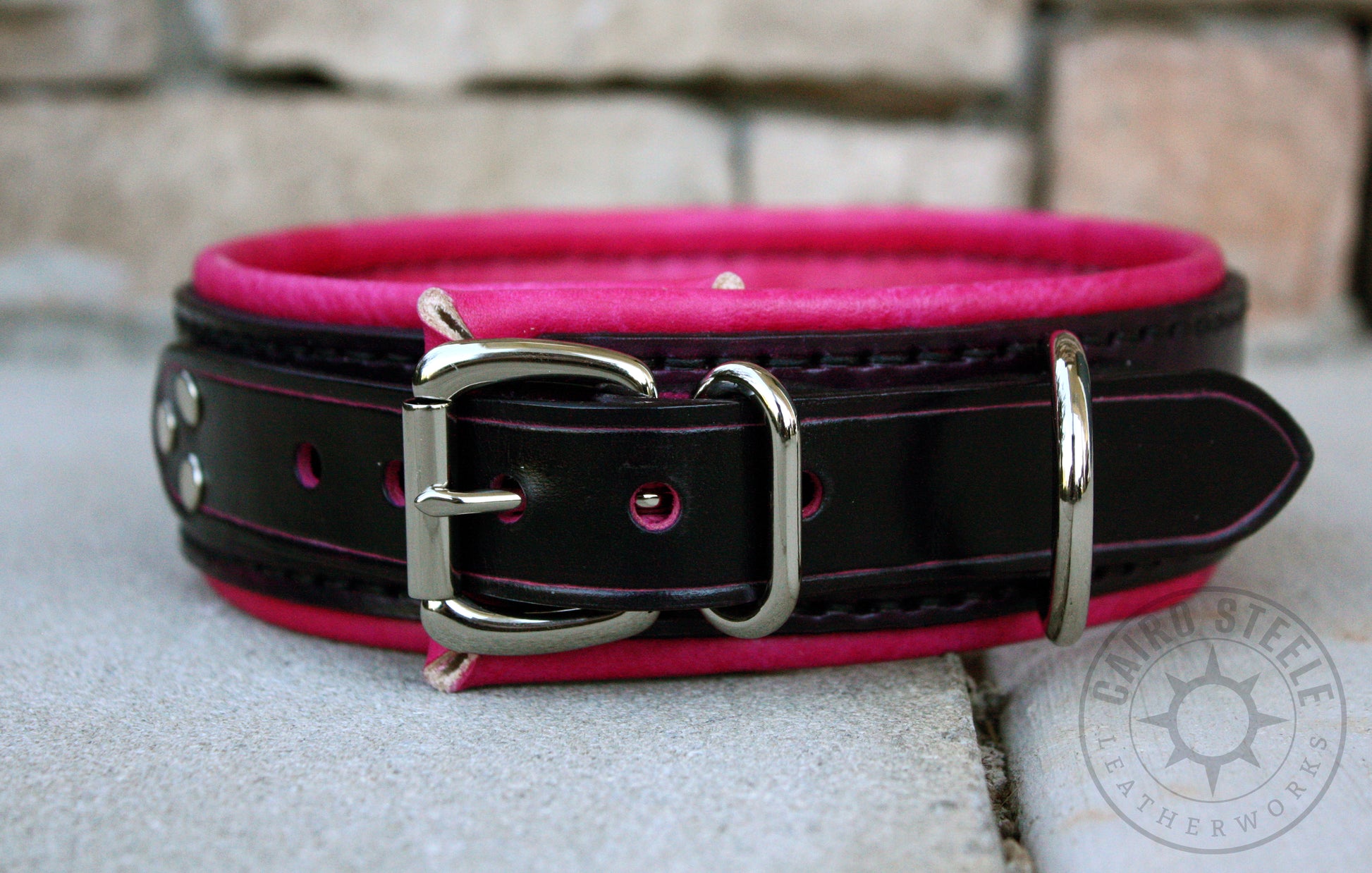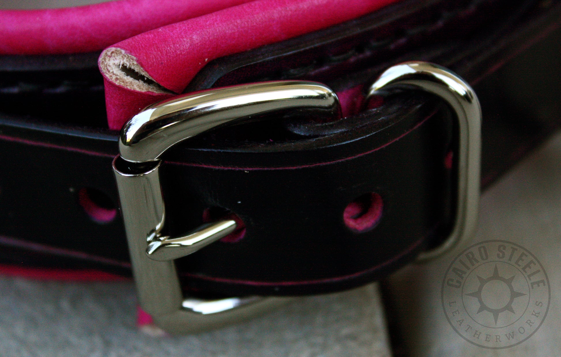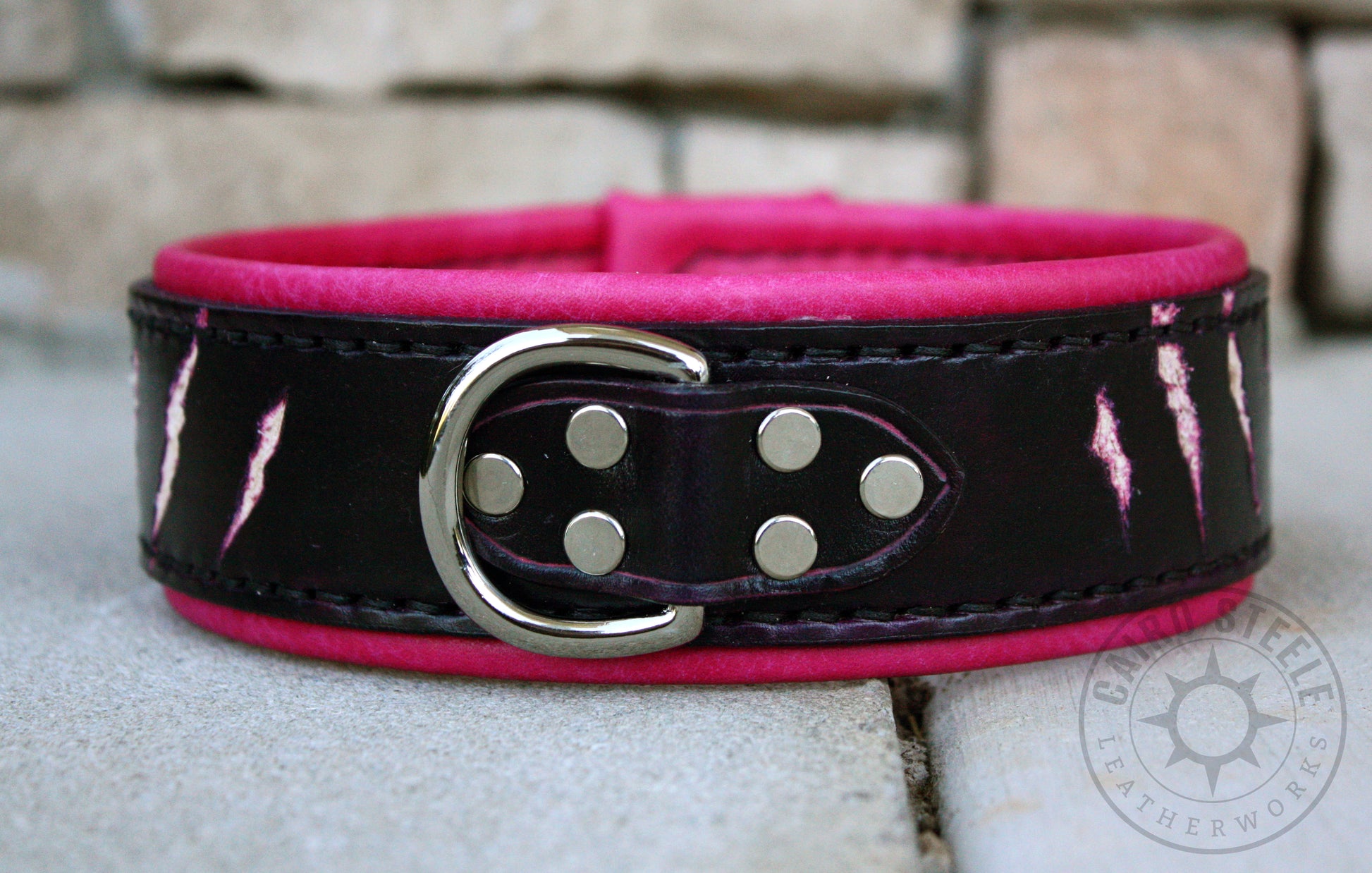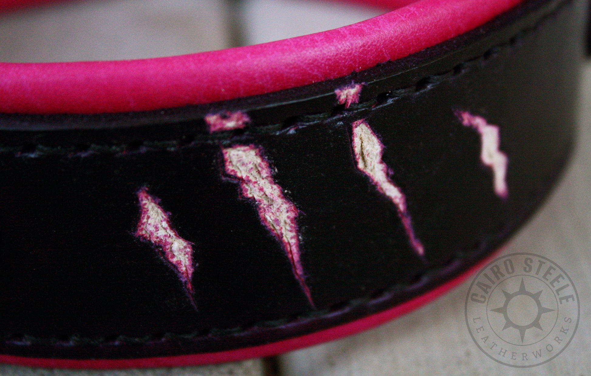 Let out your wild side with this werewolf themed collar! This spooky collar features a black body with red undertones and clawmarks carved into the base strap. It has a reddish-magenta liner, black stitching, and nickel plated brass hardware.