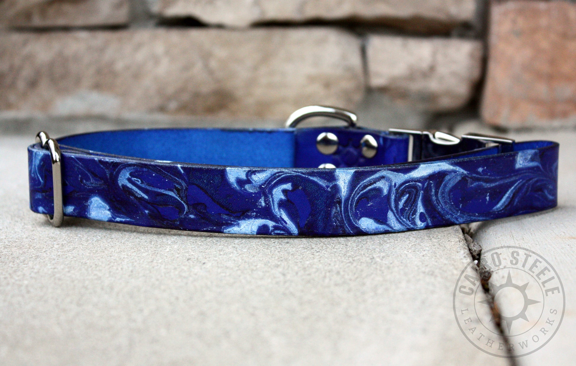 Looking for an economical collar that's discreet enough to wear in public, but still gives you those "good dog" feelings? This beautiful leather puppy collar is for you! This 1" leather collar is cut, dyed, and assembled completely by hand. It has a blue strap marbled with dark blue and metallic silver, and shiny silver colored hardware.