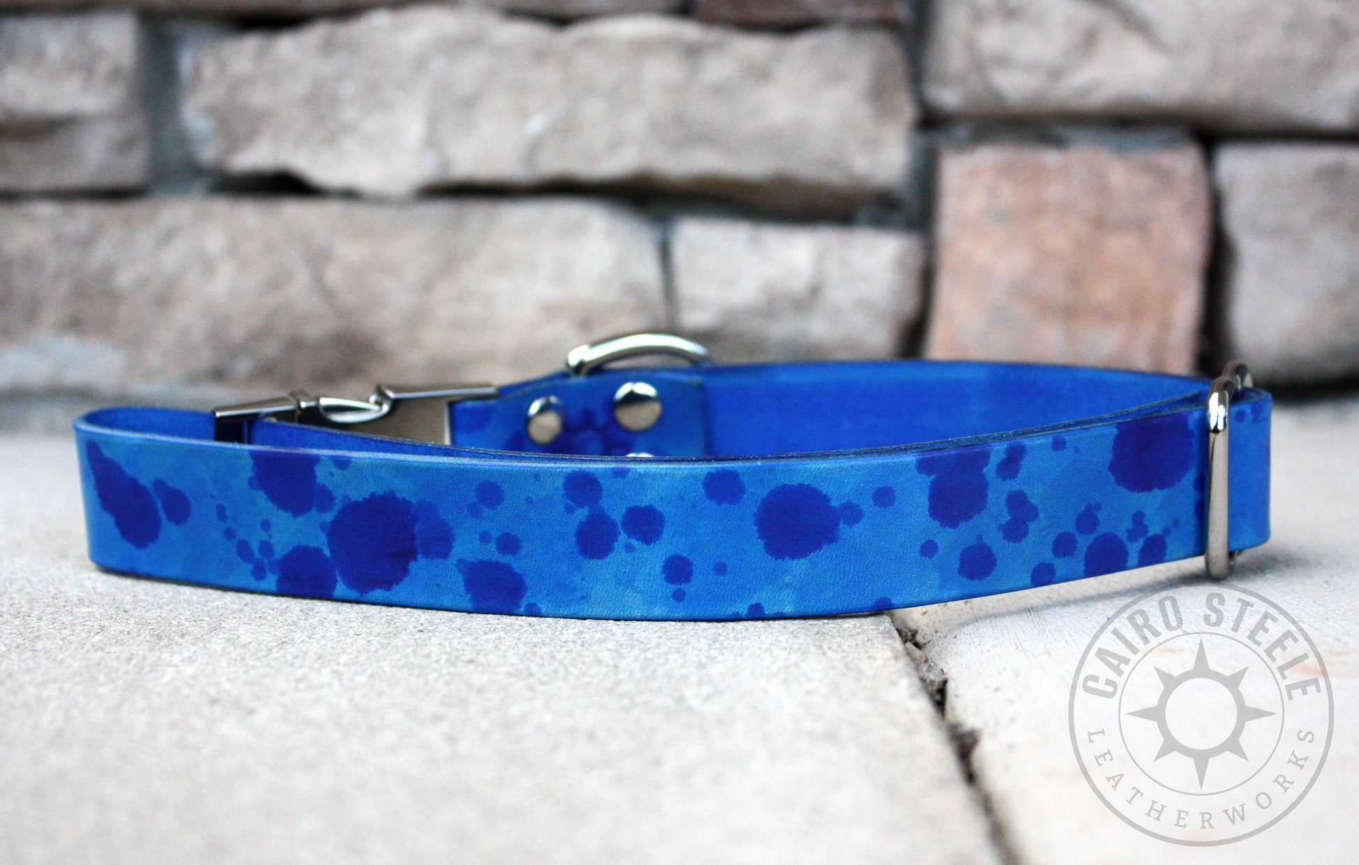 Looking for an economical collar that's discreet enough to wear in public, but still gives you those "good dog" feelings? This beautiful leather puppy collar is for you! This 1" leather collar is cut, dyed, and assembled completely by hand. It has a light blue strap with dark blue splatters, and shiny silver colored hardware.