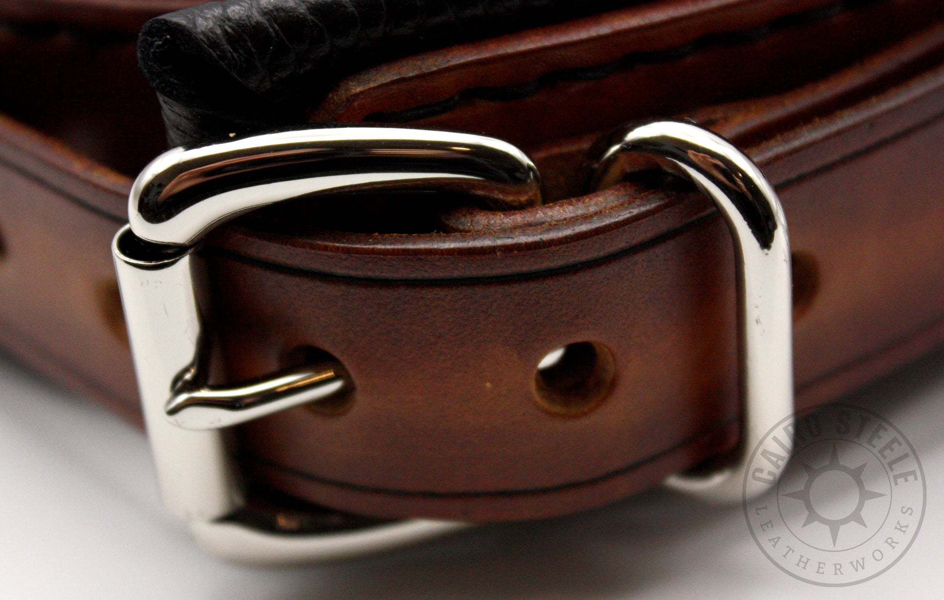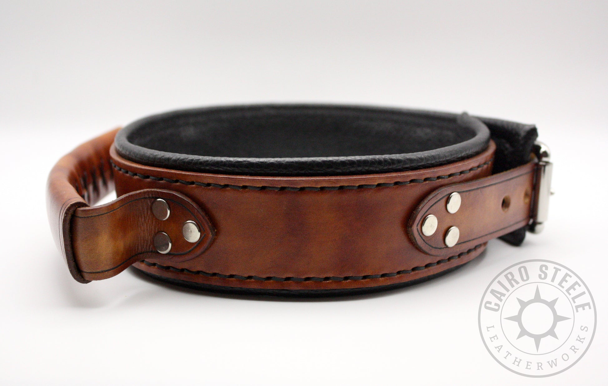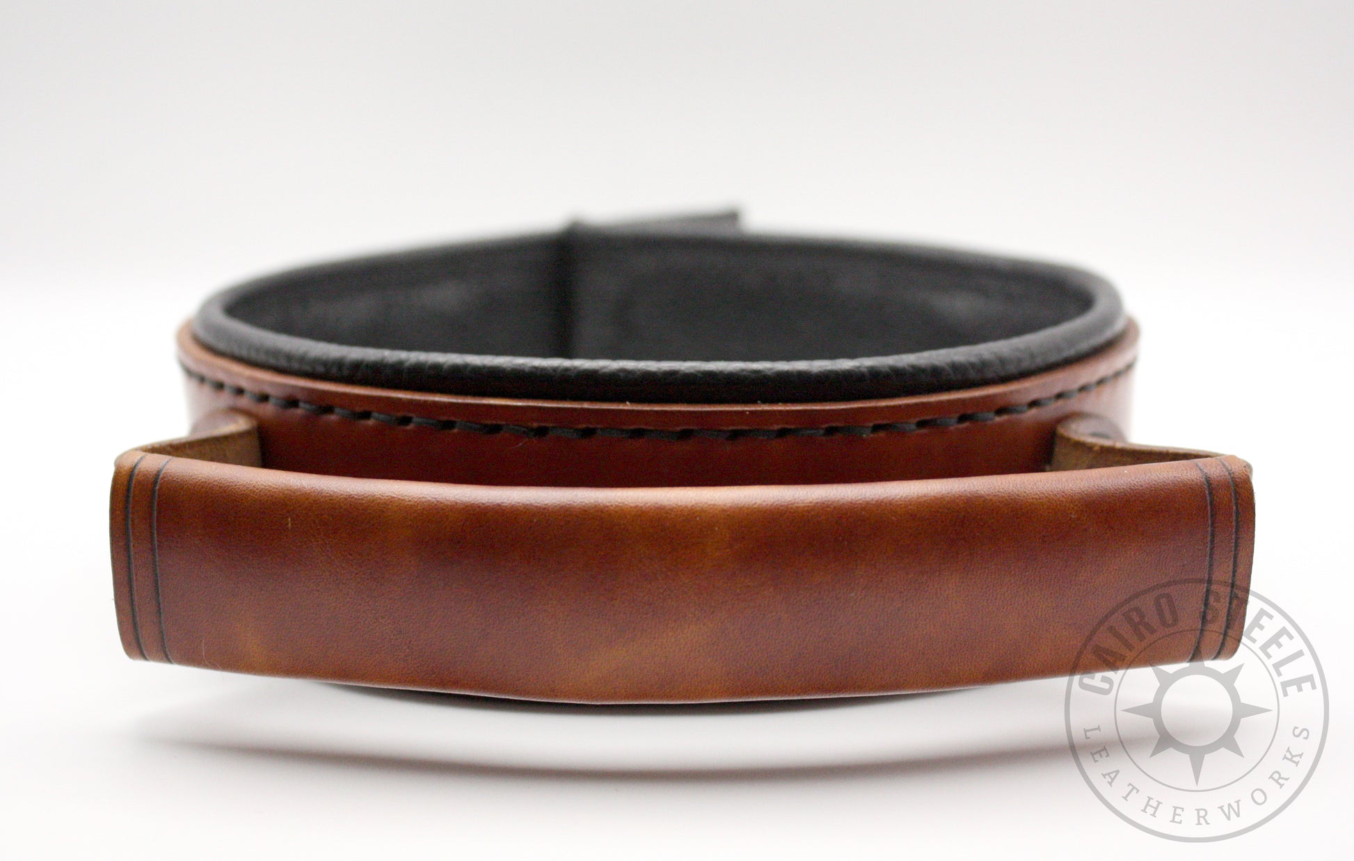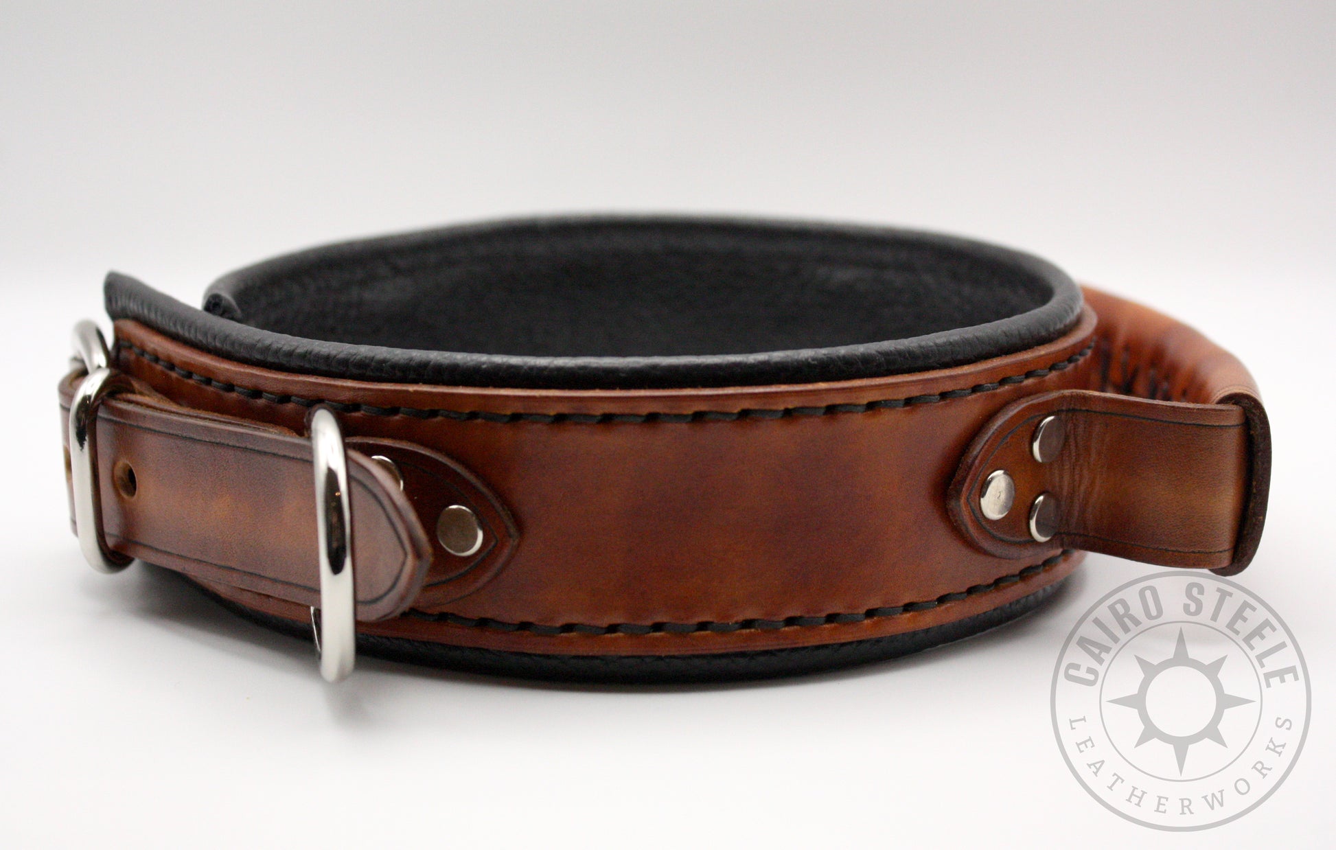 Whether you're dressing up for Sir to take you into the office, or being a very good service pup for your Owner, this leather pull collar will elevate your play! This gorgeous collar features a rich brown and black body, with nickel plated brass hardware, and a leather wrapped handle riveted directly to the front.