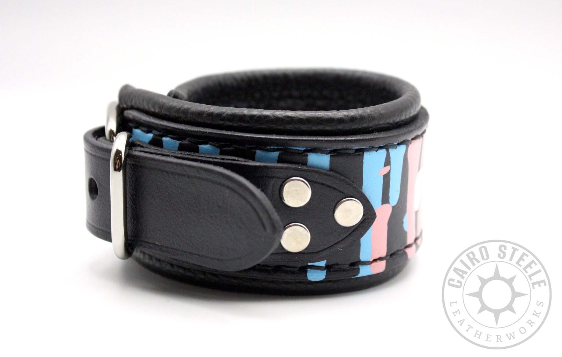 Drip with pride with a transgender pride cuff! This cuff is lovingly crafted, painted, assembled, and stitched entirely by hand from high-quality leather. It features trans flag colored paint drips on a black leather cuff, with nickel plated brass hardware, and black stitching.