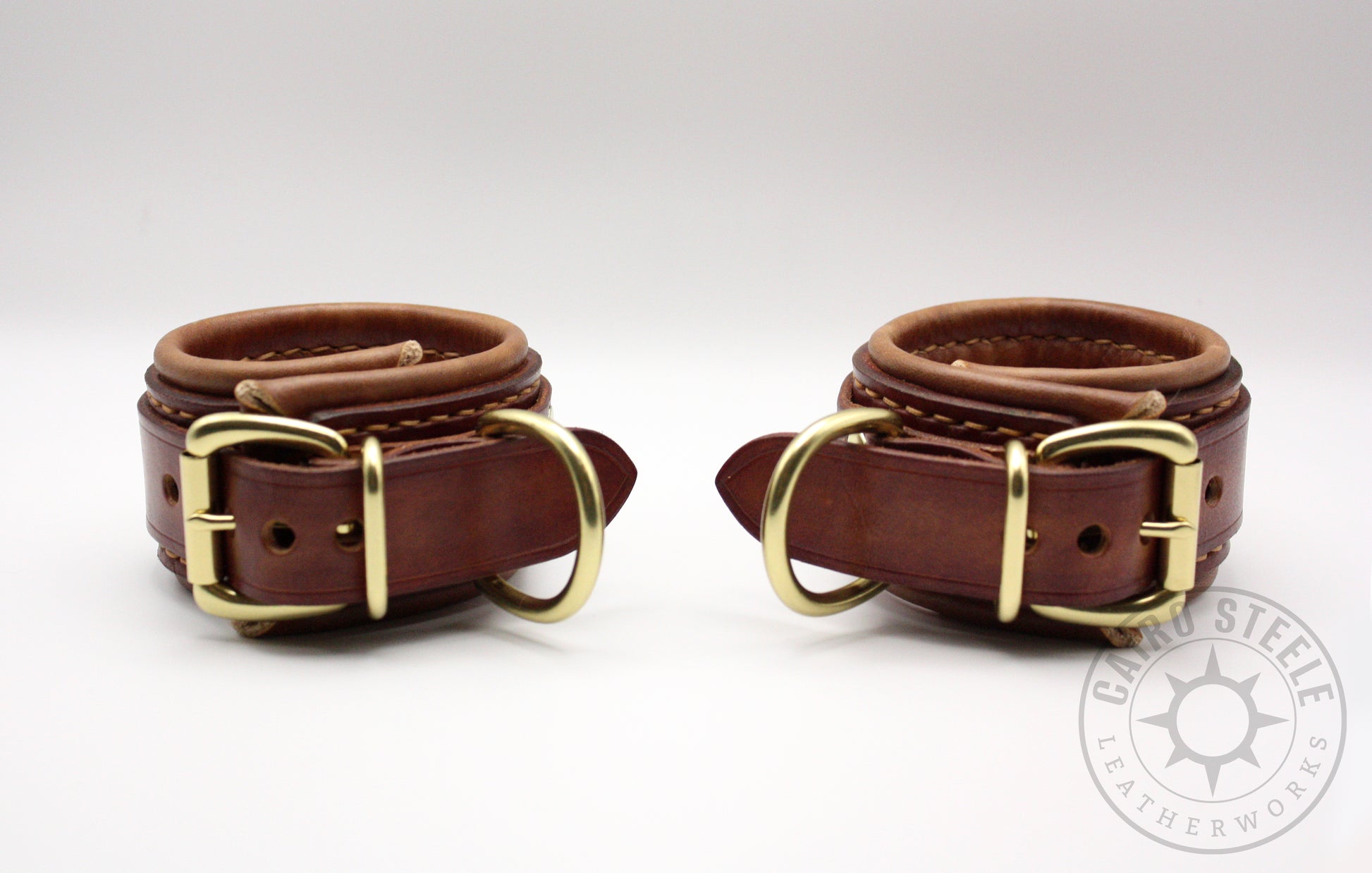 This gorgeous cuff pair features a solid dark brown body, with tan colored thread and solid brass hardware.