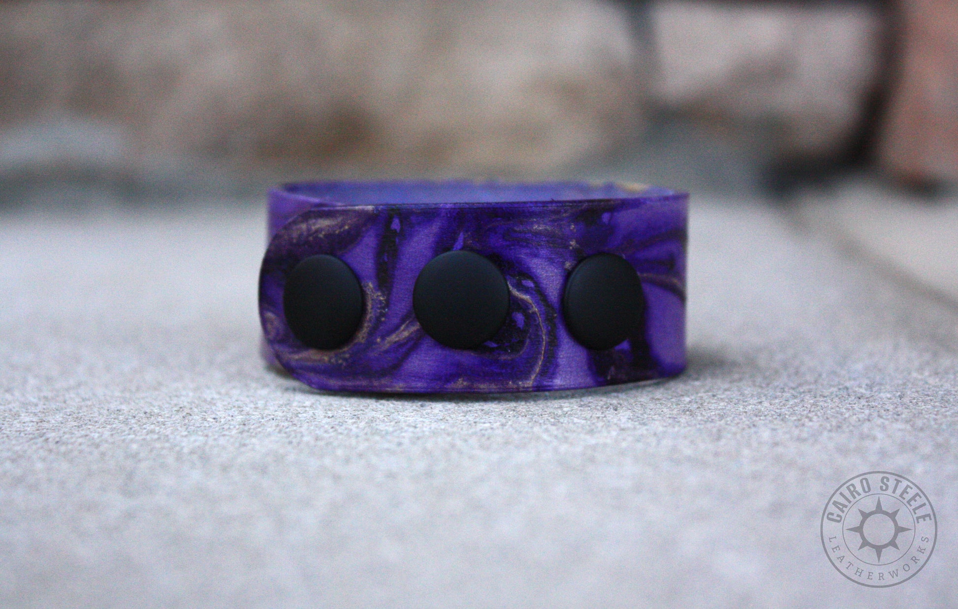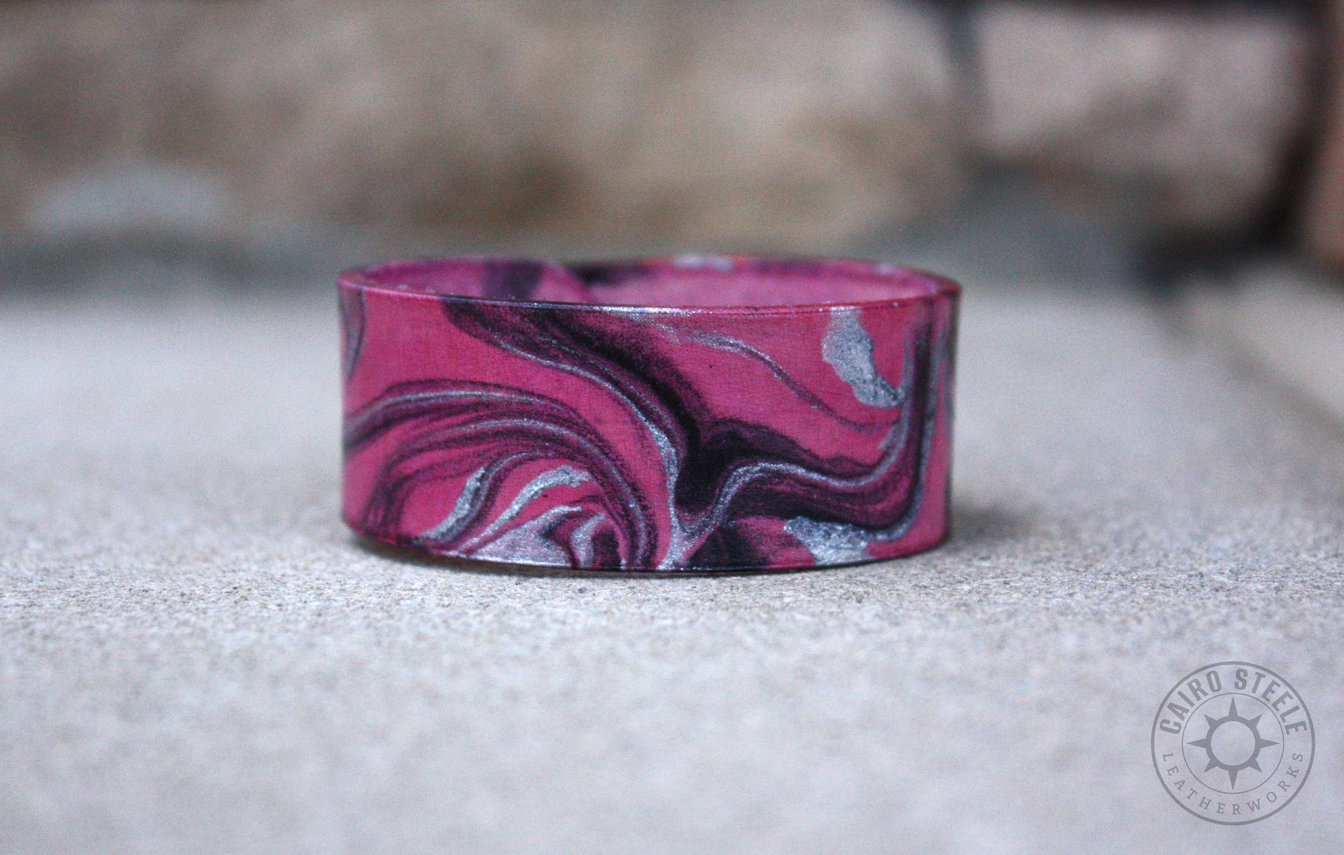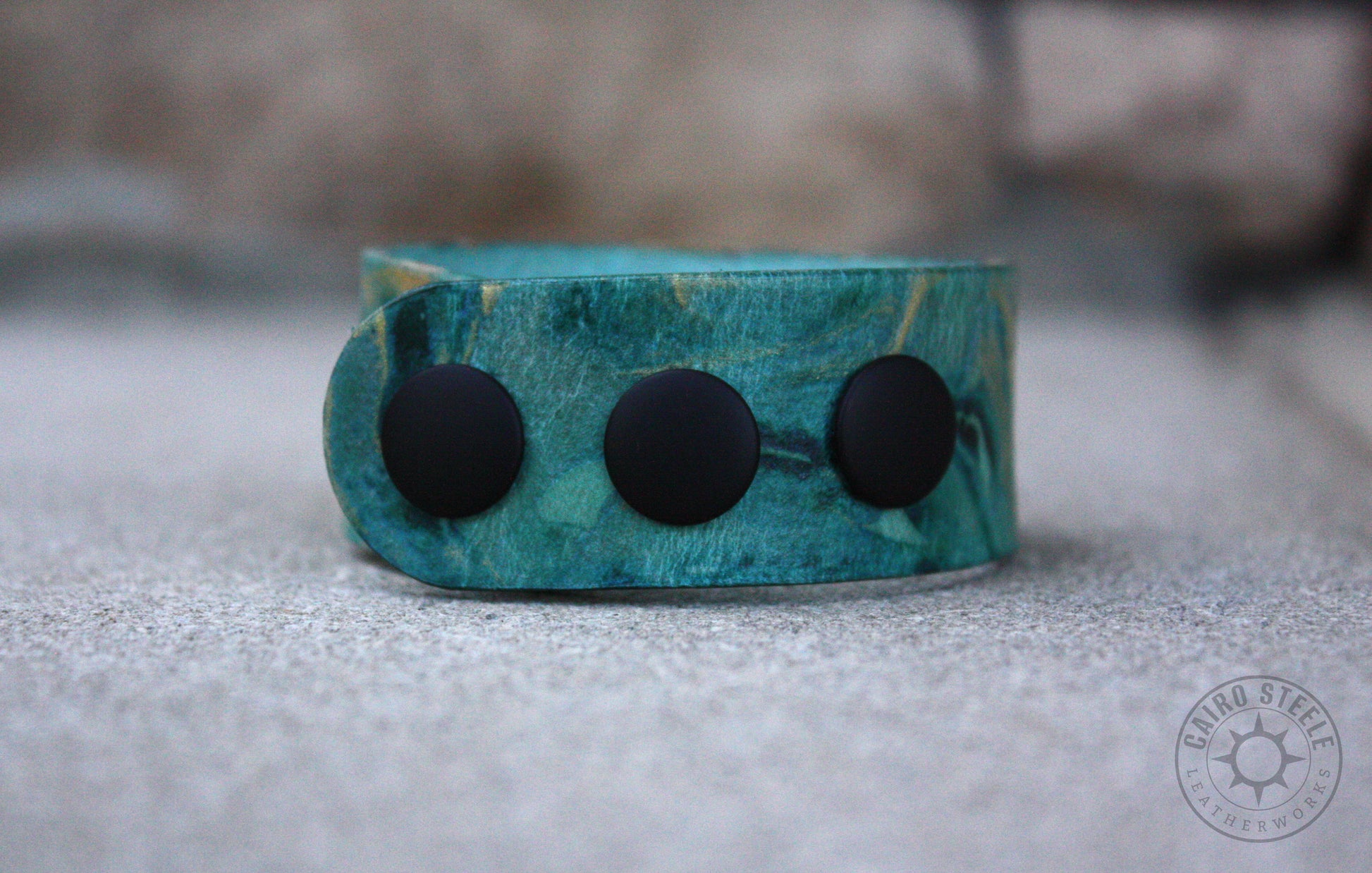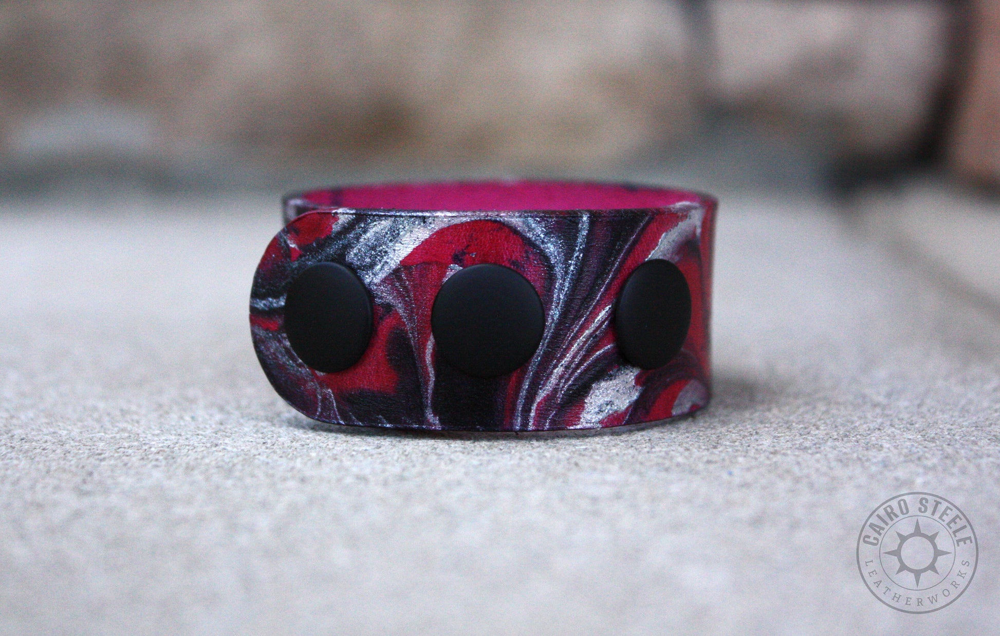 These leather bracelets are available in an array of bright marbled colors, with swirls of metallic gold or silver, and sturdy black snaps. They are cut, dyed, and assembled completely by hand. They are available in 5"-6.5" and 6.5"-8" sizes.