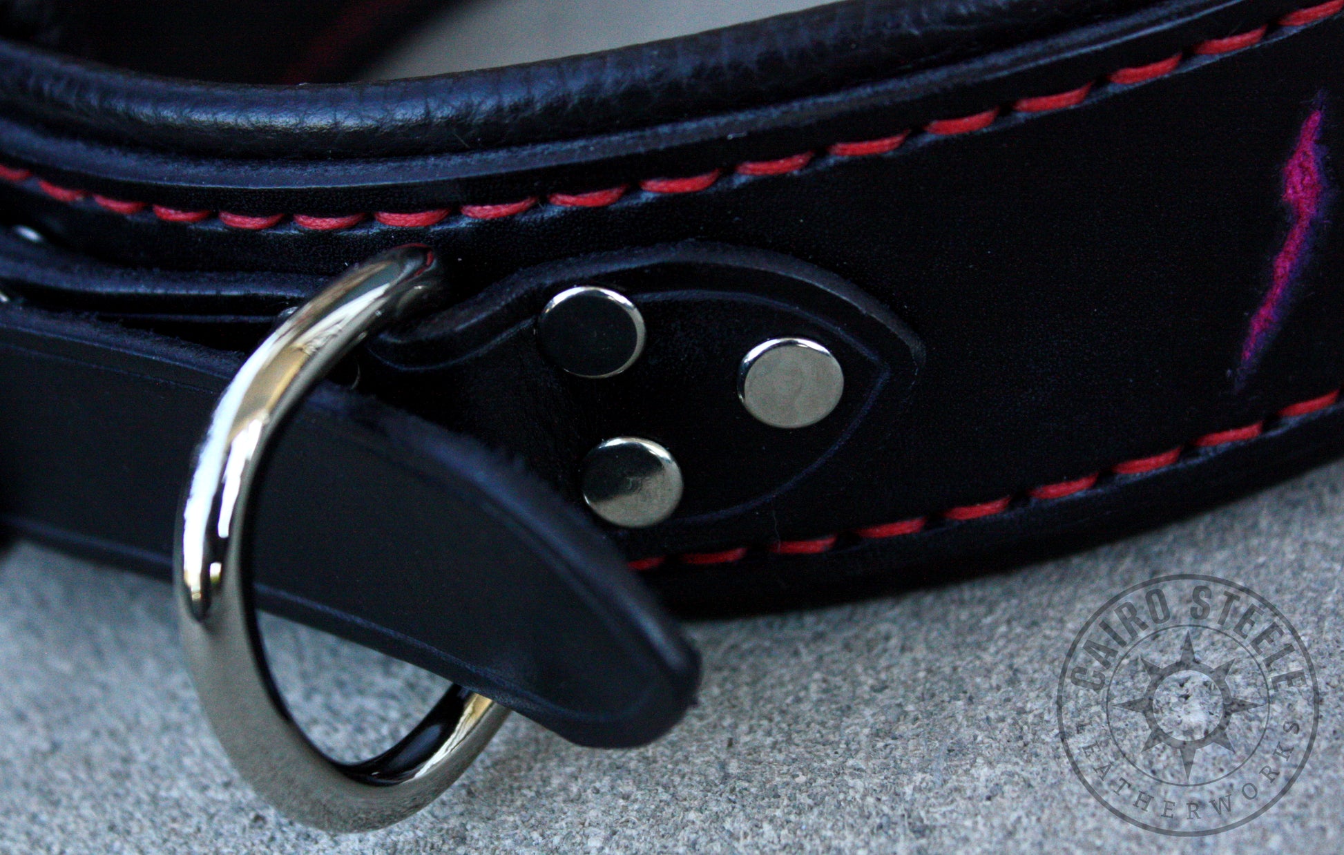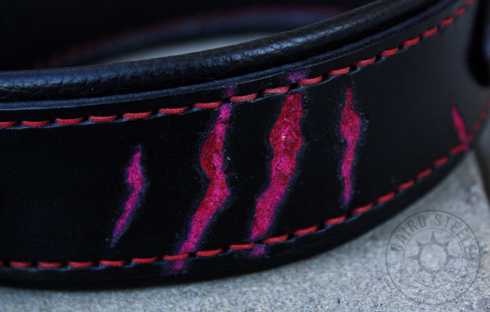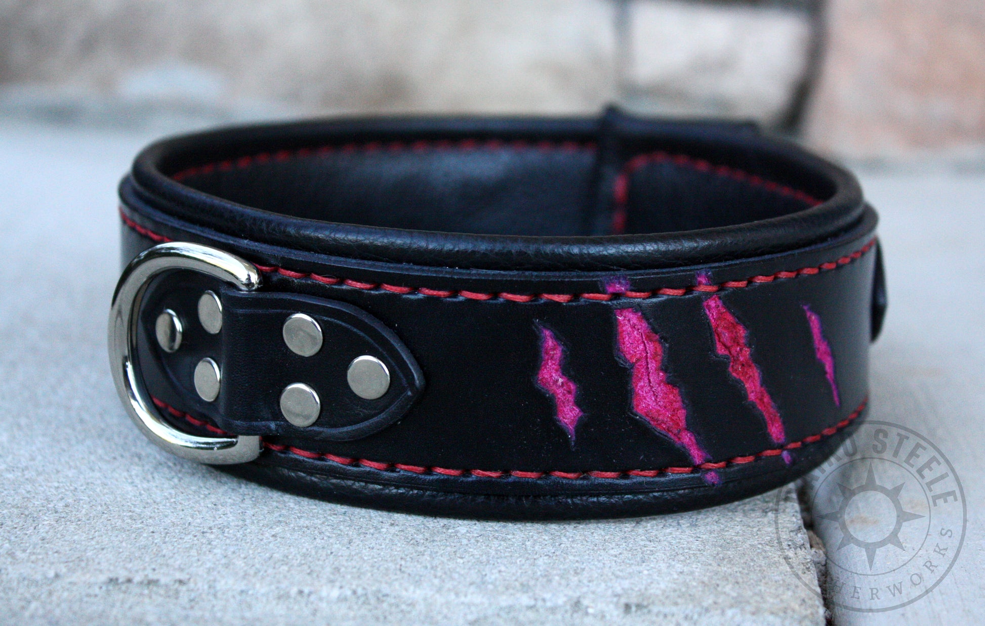 Let out your wild side with this werewolf themed collar! This spooky collar features a black body with bright red clawmarks carved into the base strap. It has a black liner, red stitching, and nickel plated brass hardware.