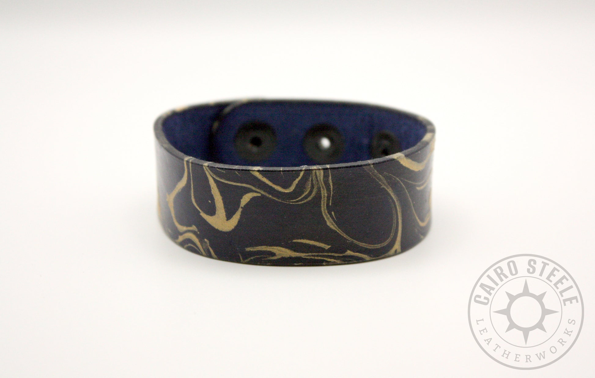 This leather bracelet features a navy leather strap marbled with swirls of metallic gold, and closes with sturdy black snaps. It is cut, dyed, and assembled completely by hand. It is adjustable from approximately 5.5" - 7"