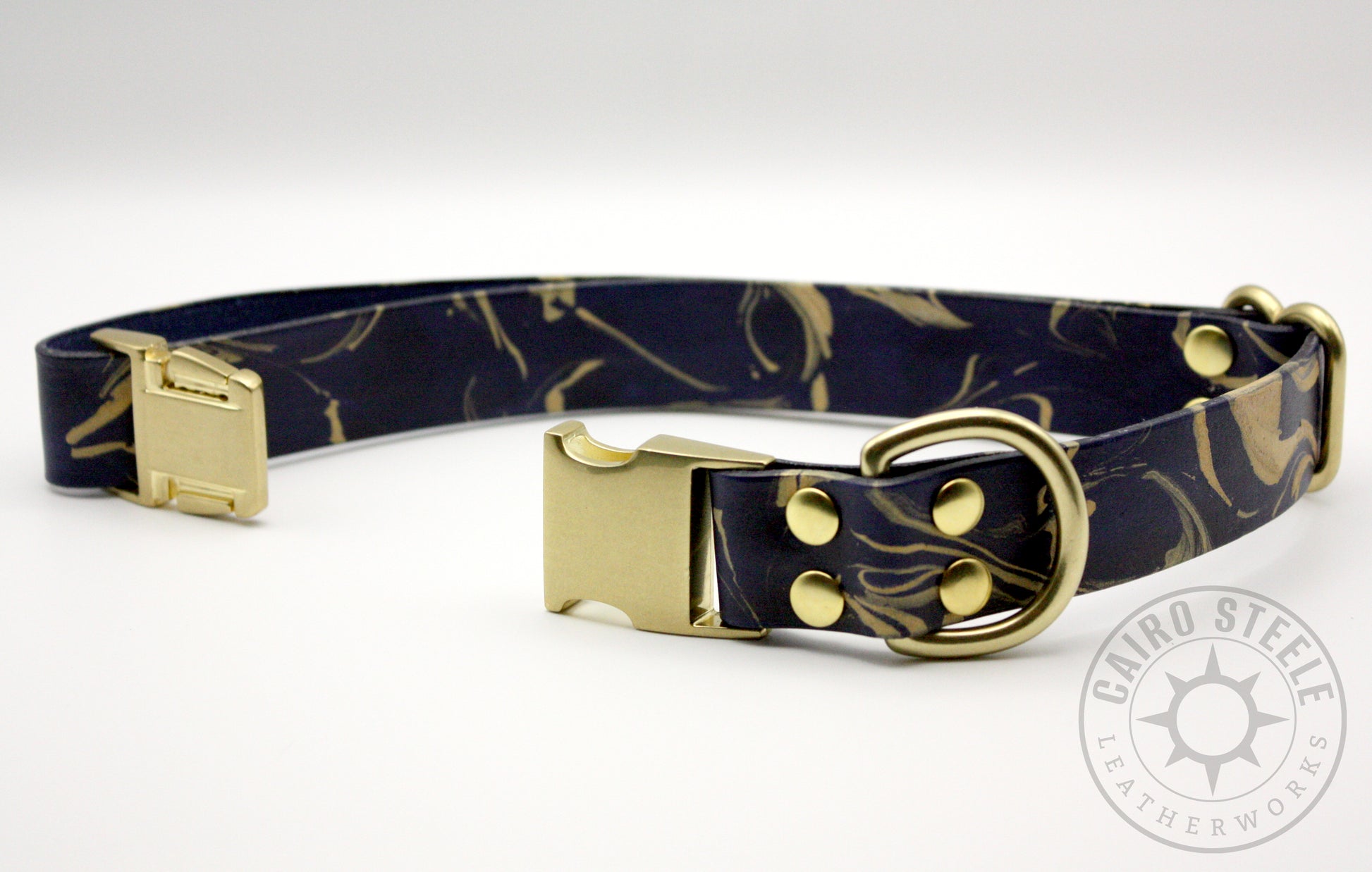 Looking for an economical collar that's discreet enough to wear in public, but still gives you those "good dog" feelings? This beautiful leather puppy collar is for you! This 1" leather collar is cut, dyed, and assembled completely by hand. It has a navy strap marbled with metallic gold, and shiny gold colored hardware.