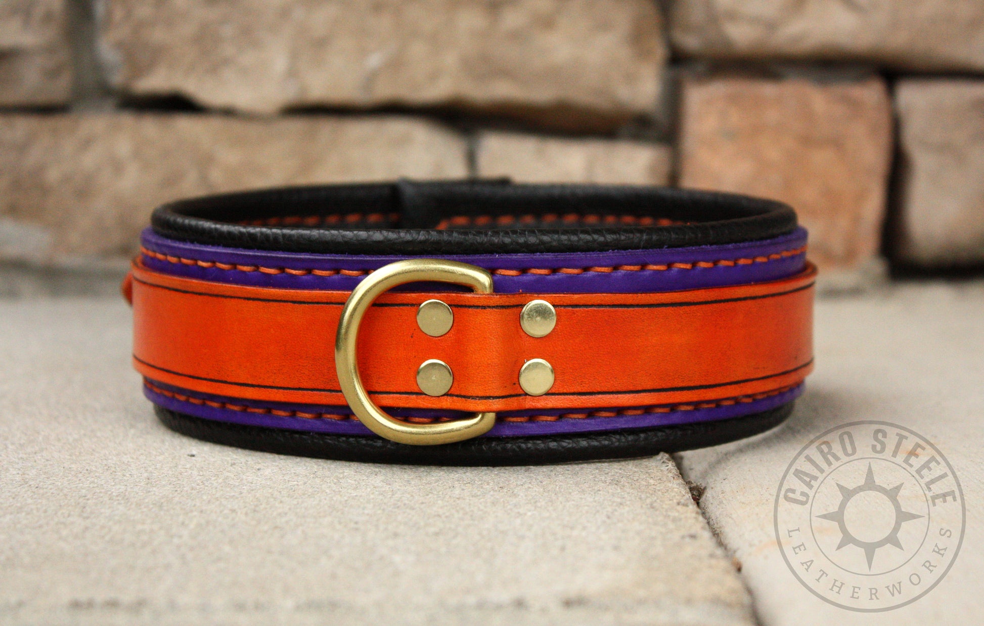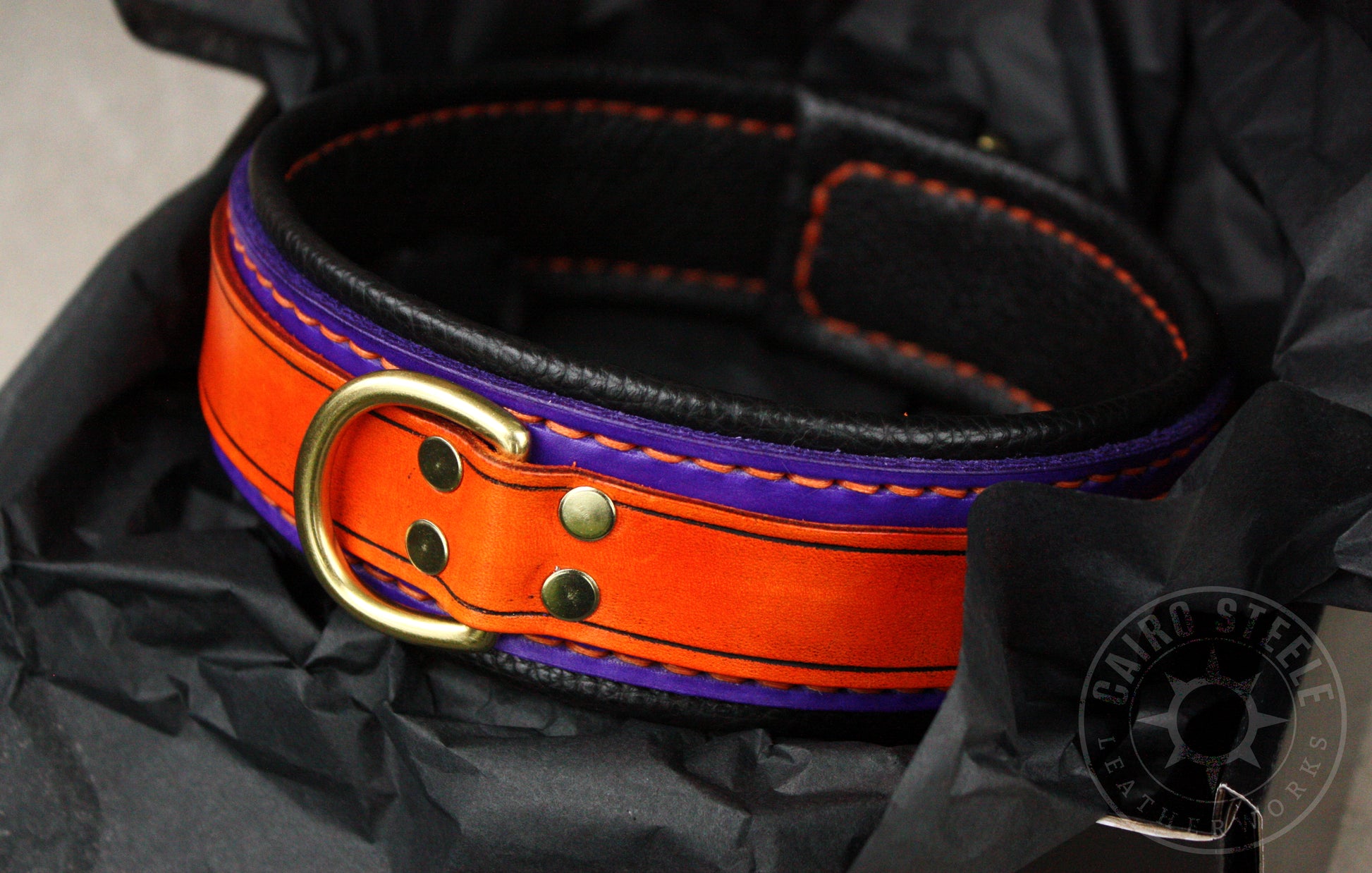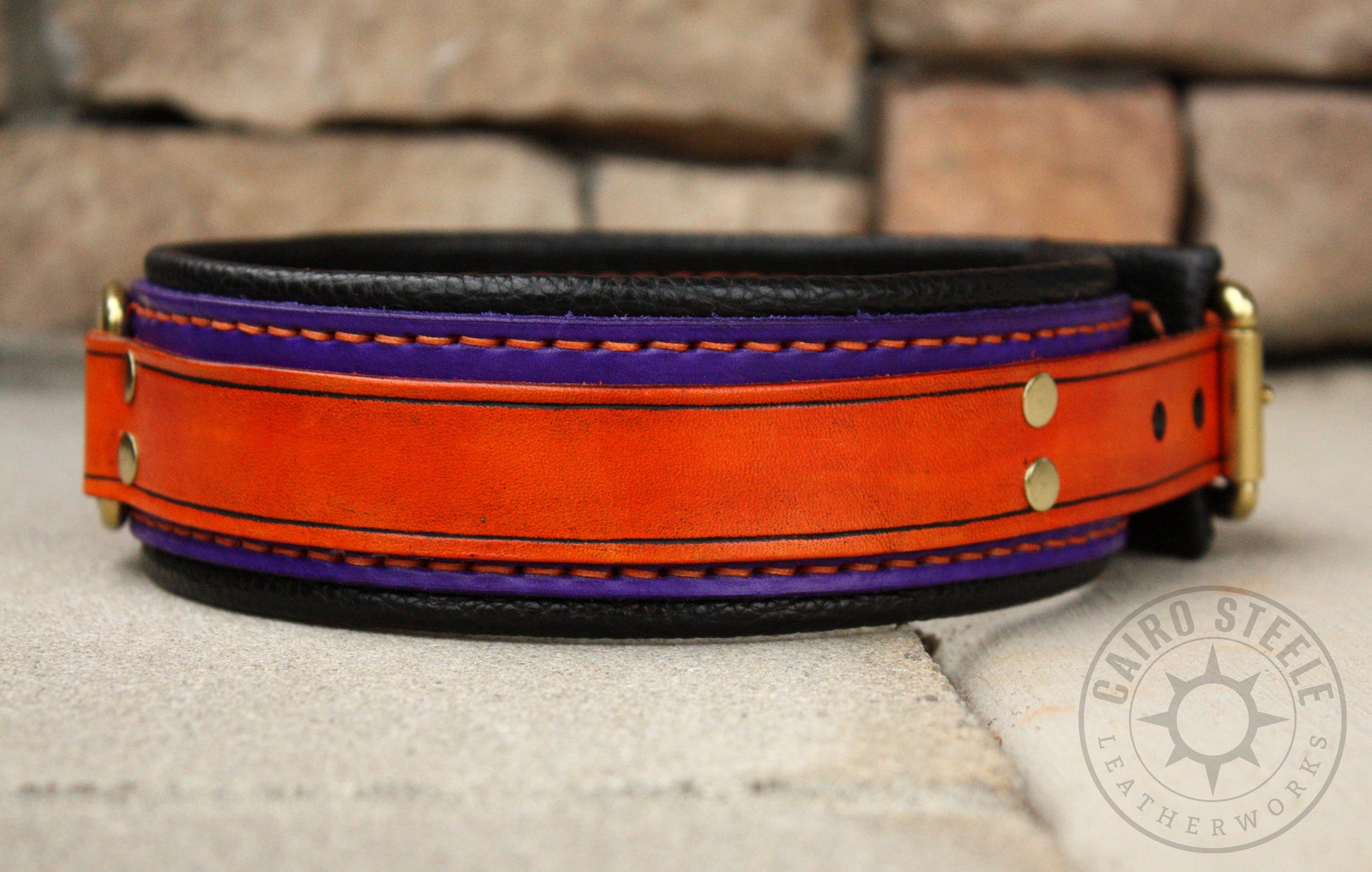 This spooky collar features a bright orange top strap over a purple base strap and black liner, with orange thread and solid brass hardware.
