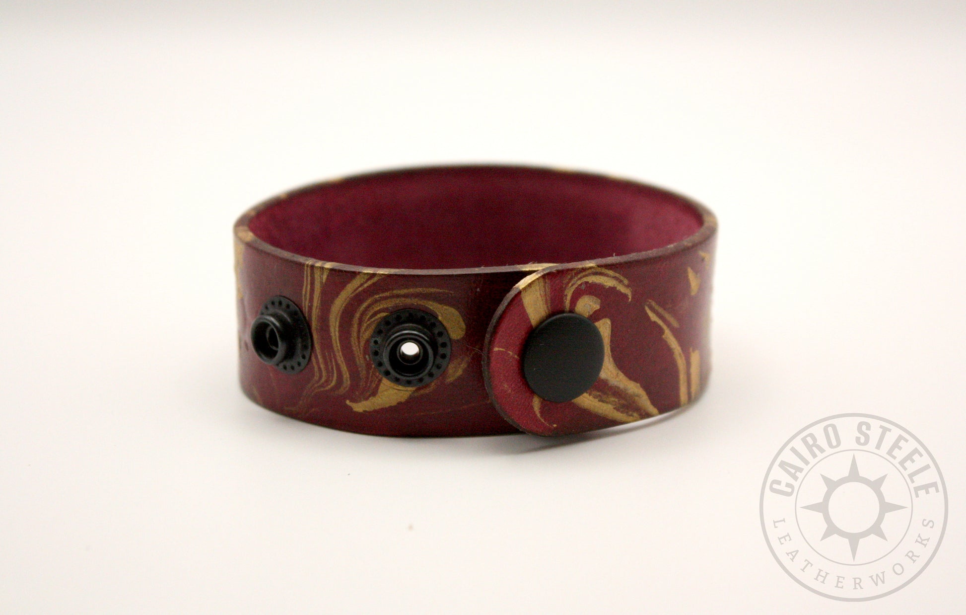 This leather bracelet features an oxblood leather strap marbled with swirls of metallic gold, and closes with sturdy black snaps. It is cut, dyed, and assembled completely by hand. It is adjustable from approximately 5.5" - 7"
