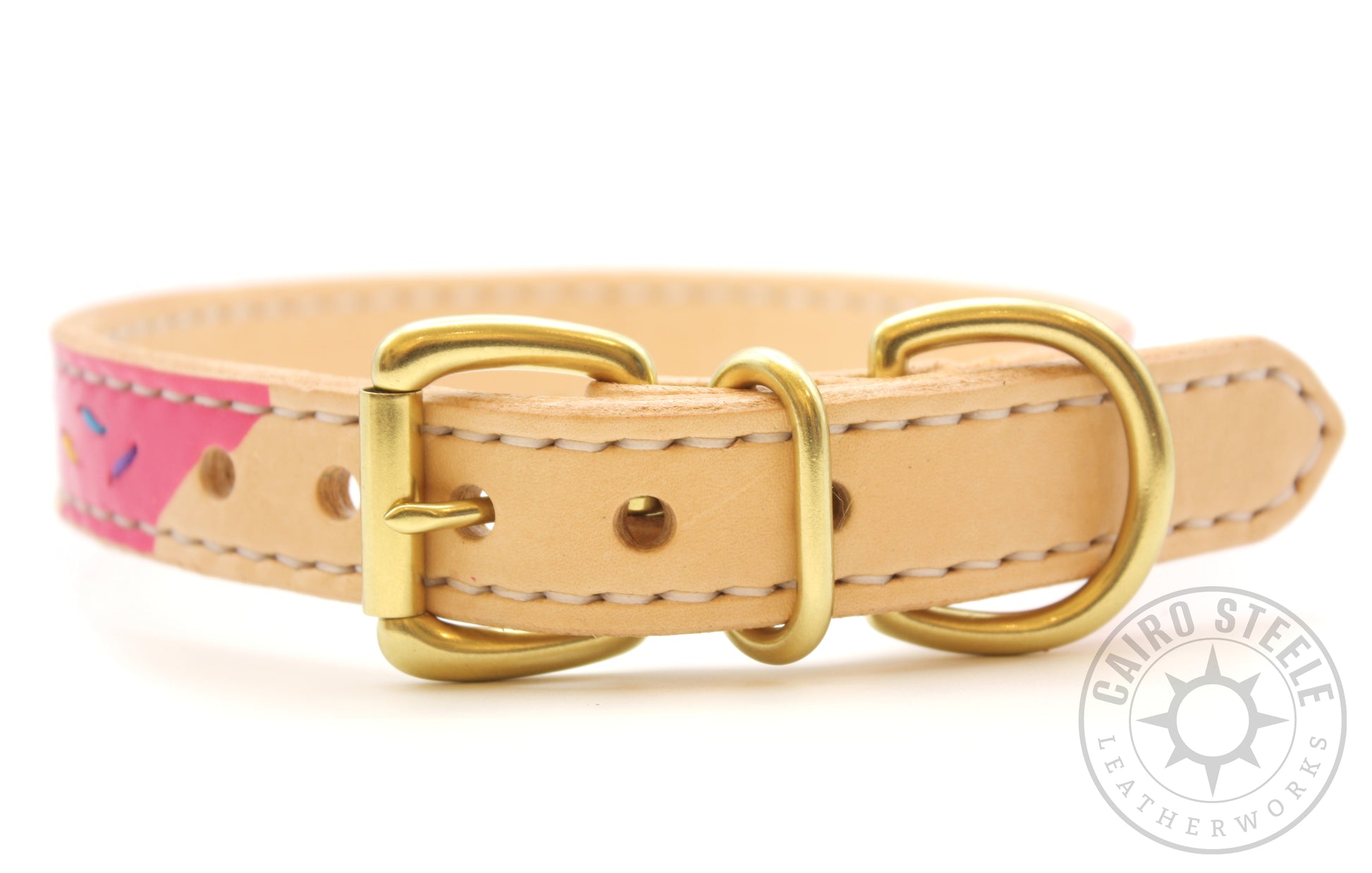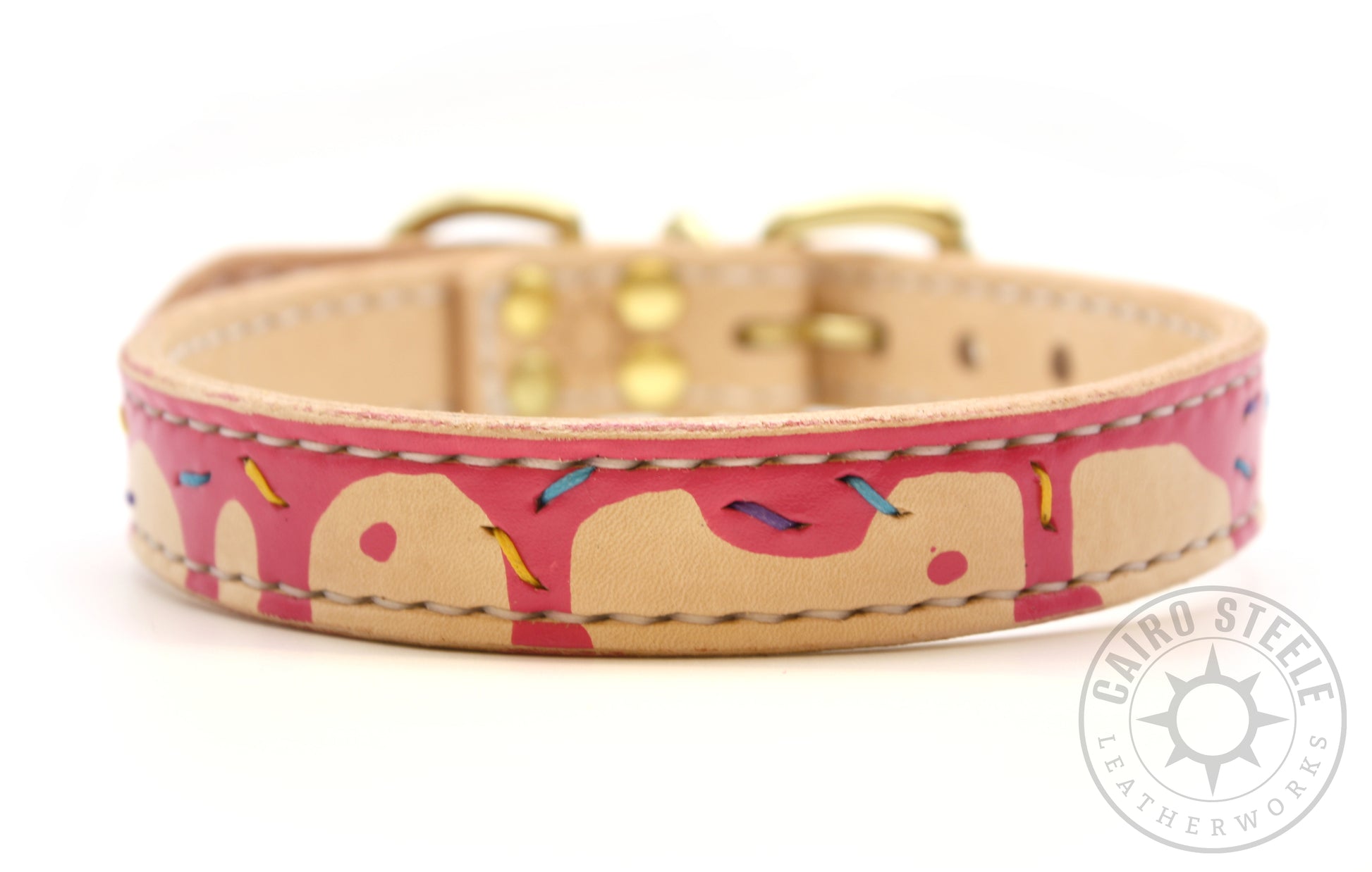 Introducing a new style of collar from my Bakery Series- the Glazed Donut collar! This delicious collar features a natural tan body with a drippy pink paint "glaze" and embroidered rainbow sprinkles. It has white stitching all around the border and solid brass hardware.