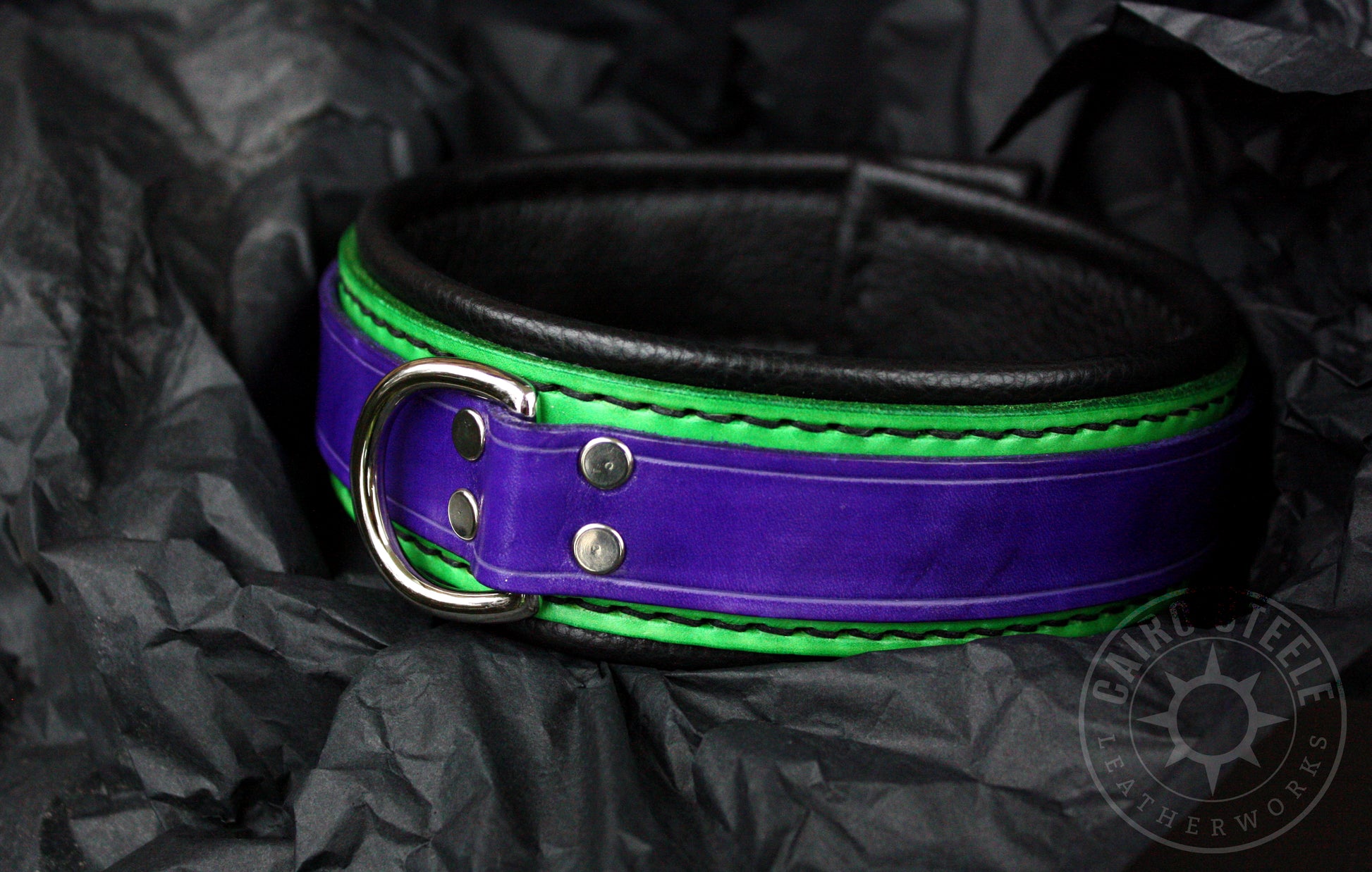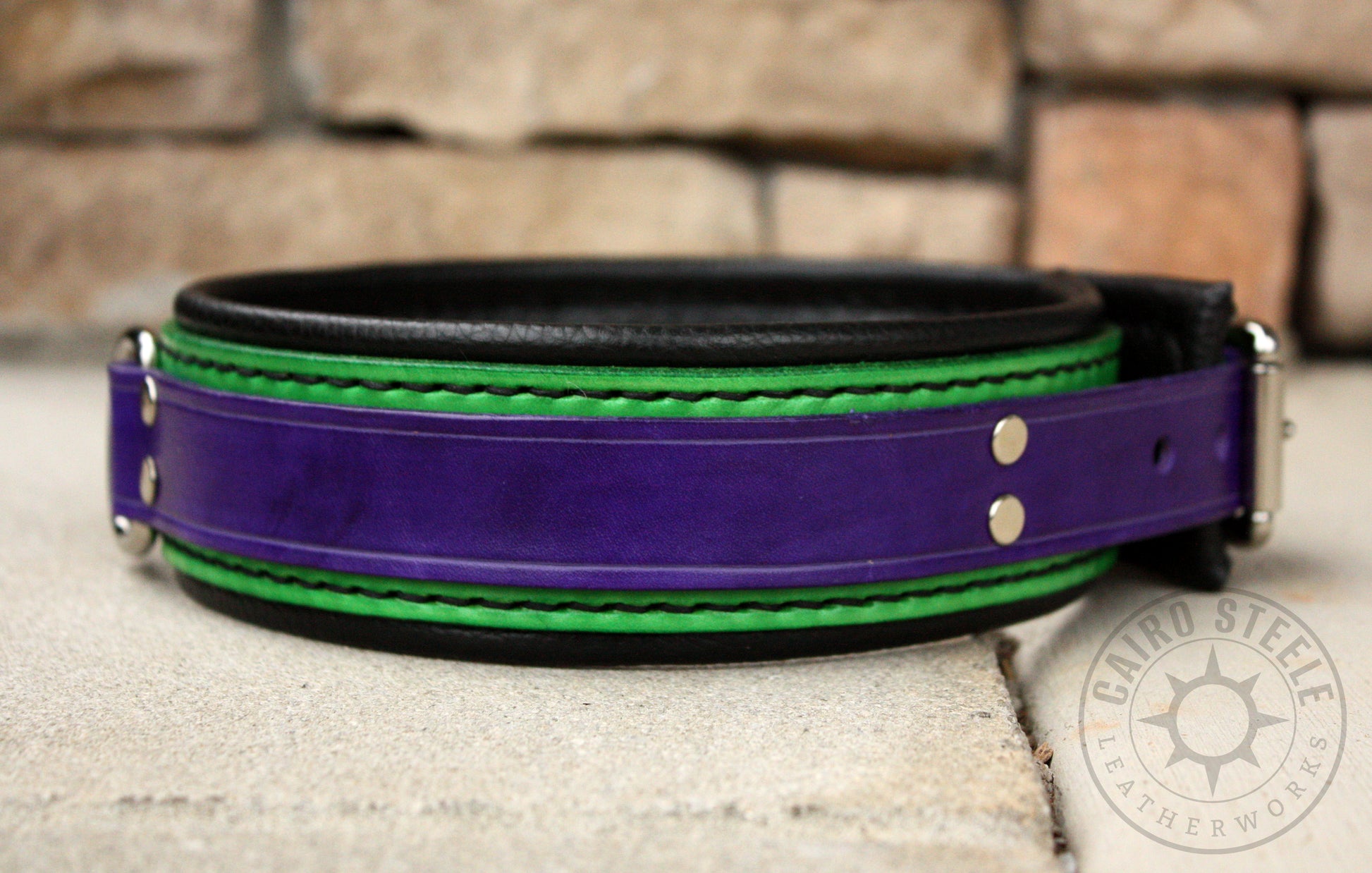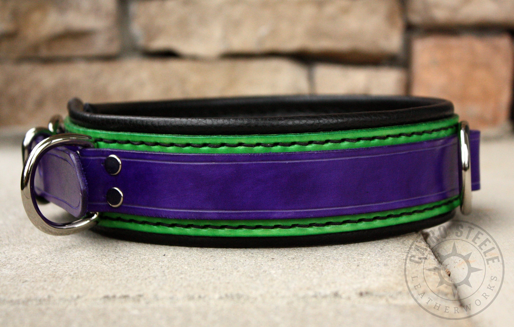 This spooky collar features a deep purple top strap over a bright green base strap and black liner, with black thread and nickel plated brass hardware.