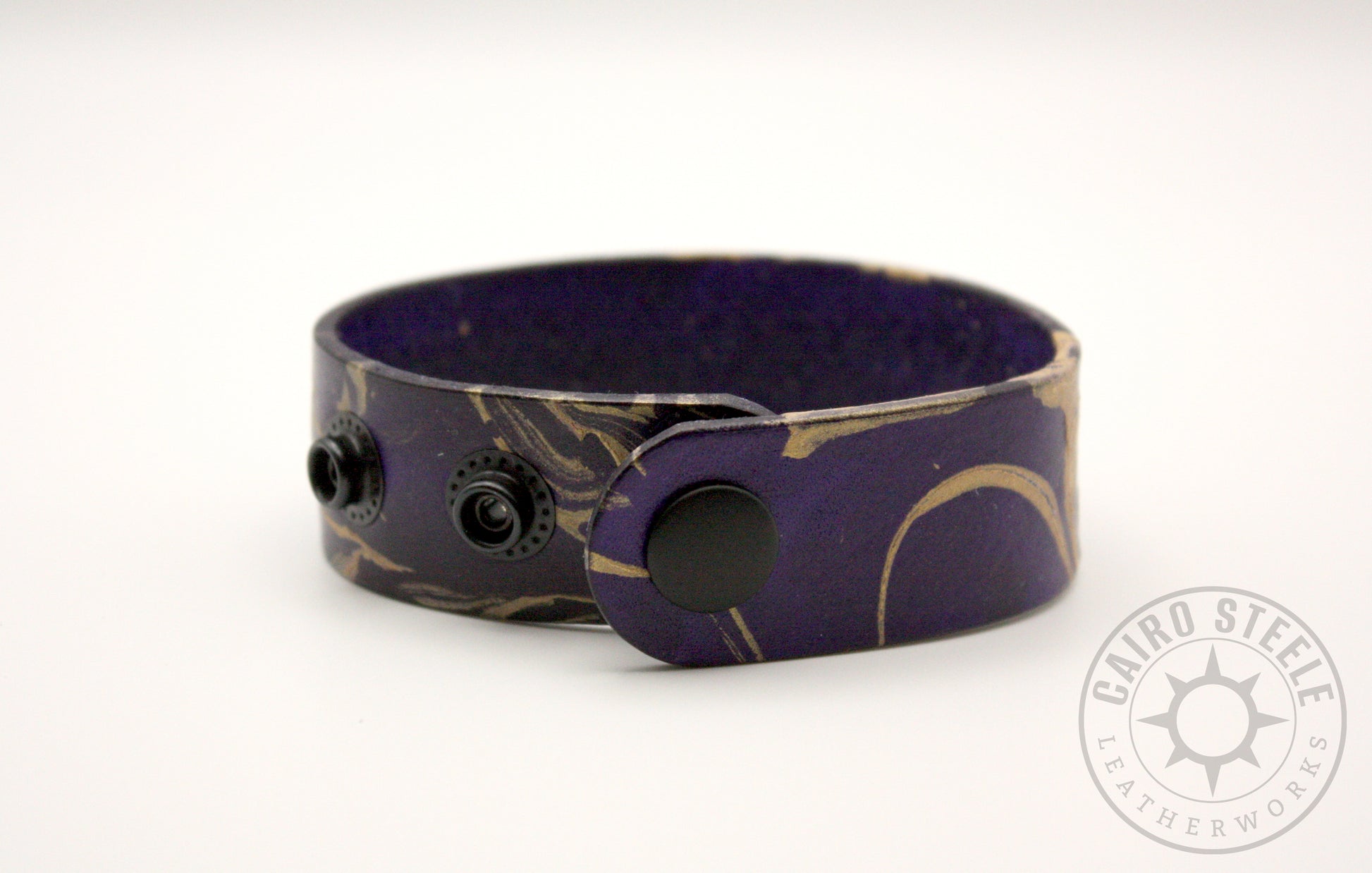 This leather bracelet features a purple leather strap marbled with swirls of metallic gold, and closes with sturdy black snaps. It is cut, dyed, and assembled completely by hand. It is adjustable from approximately 5.5" - 7"