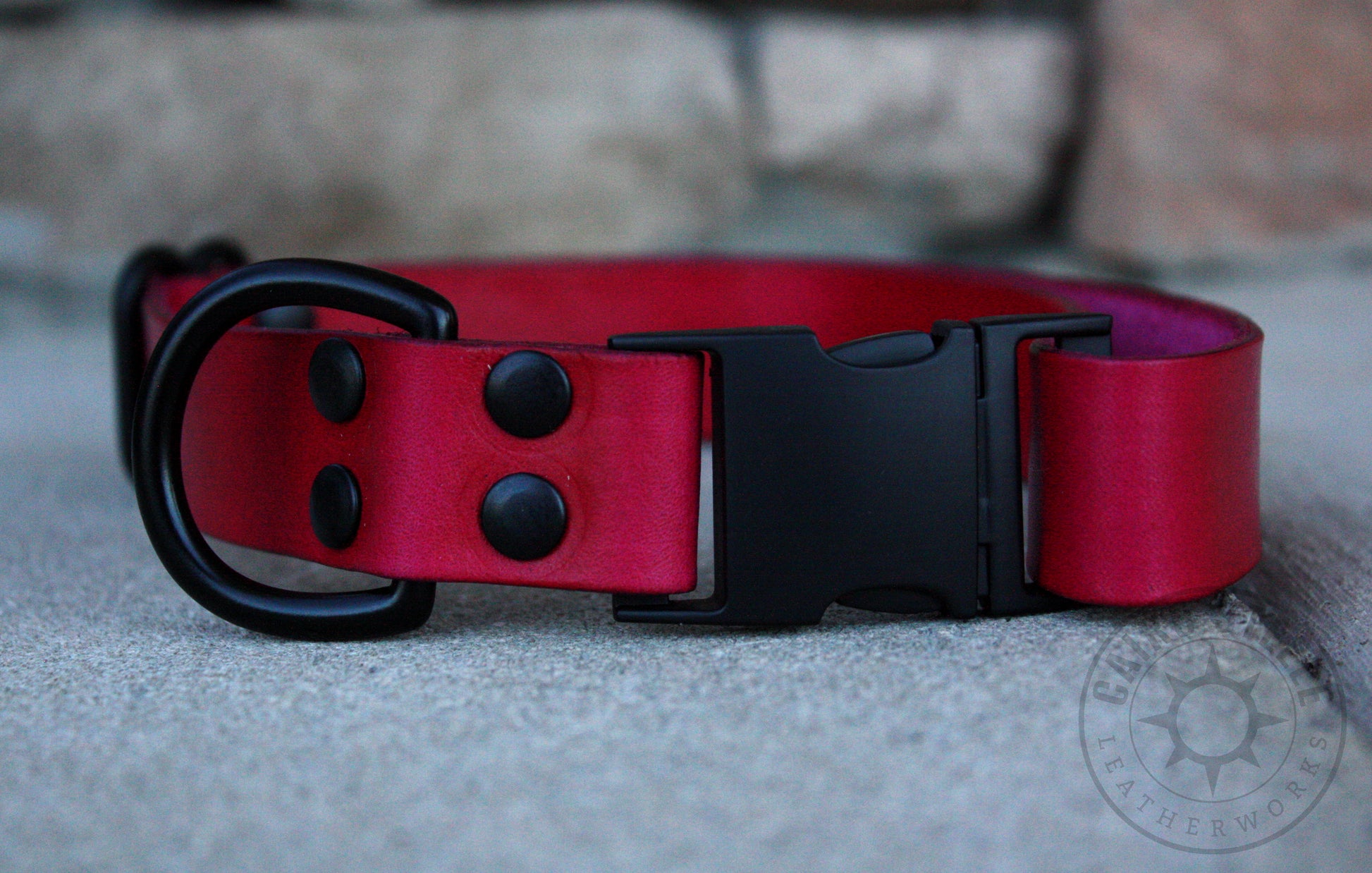 Looking for an economical collar that's discreet enough to wear in public, but still gives you those "good dog" feelings? This beautiful leather puppy collar is for you! This 1" leather collar is cut, dyed, and assembled completely by hand, with a vibrant red strap and black metal hardware.