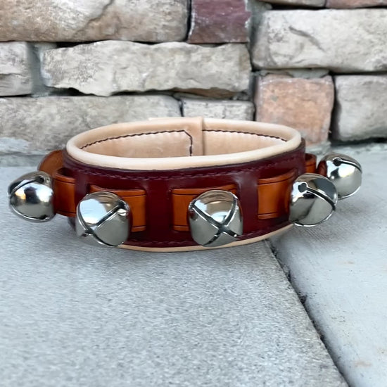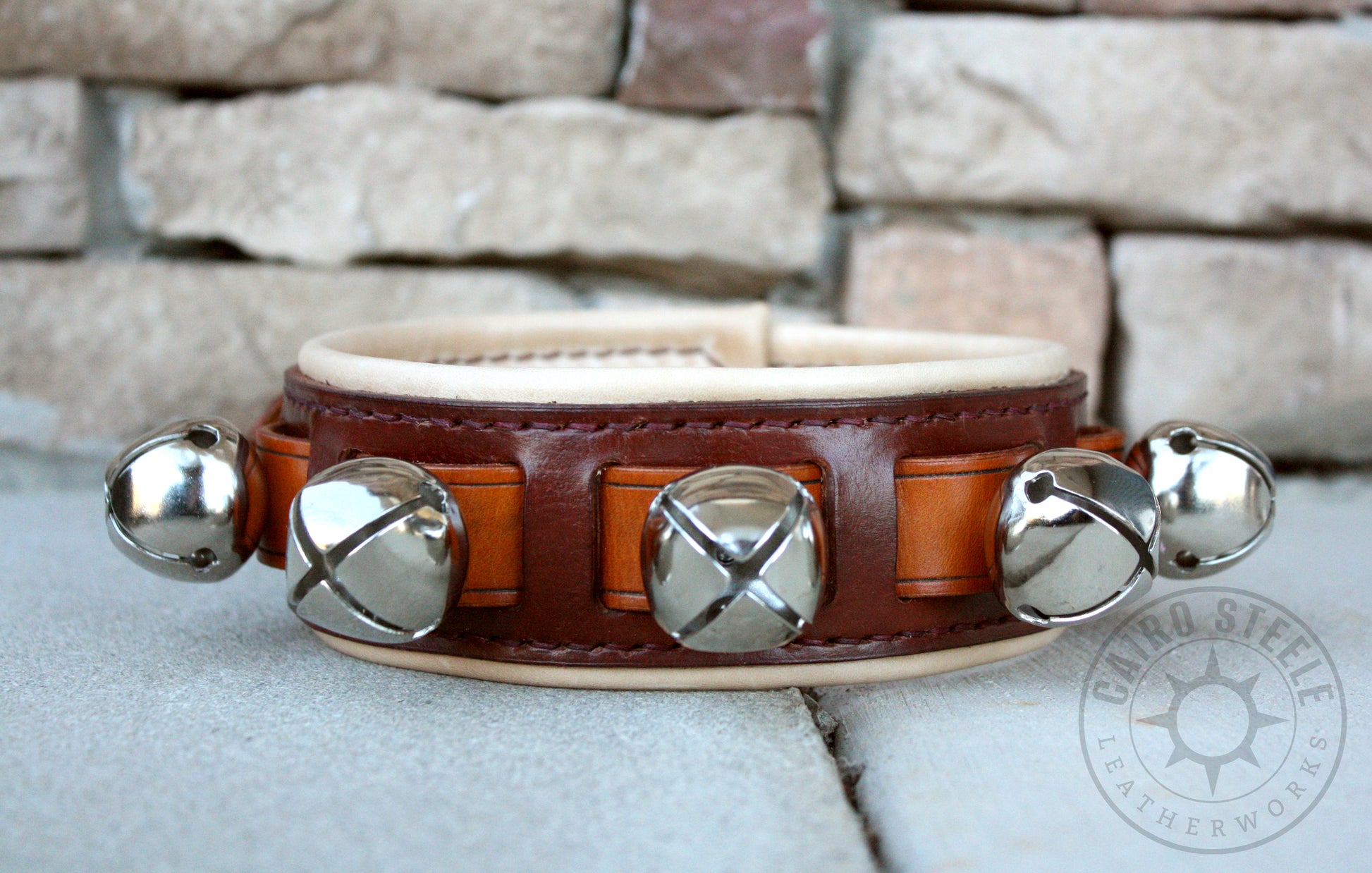 Do you hear those sleigh bells ringing? Jingle bell season is here, and what better way to celebrate than with a festive leather collar! This handmade collar has a saddle tan top strap woven into a dark brown base strap, with a natural beige liner, and dark brown stitching. The hardware is nickel plated brass with matching silver colored bells.