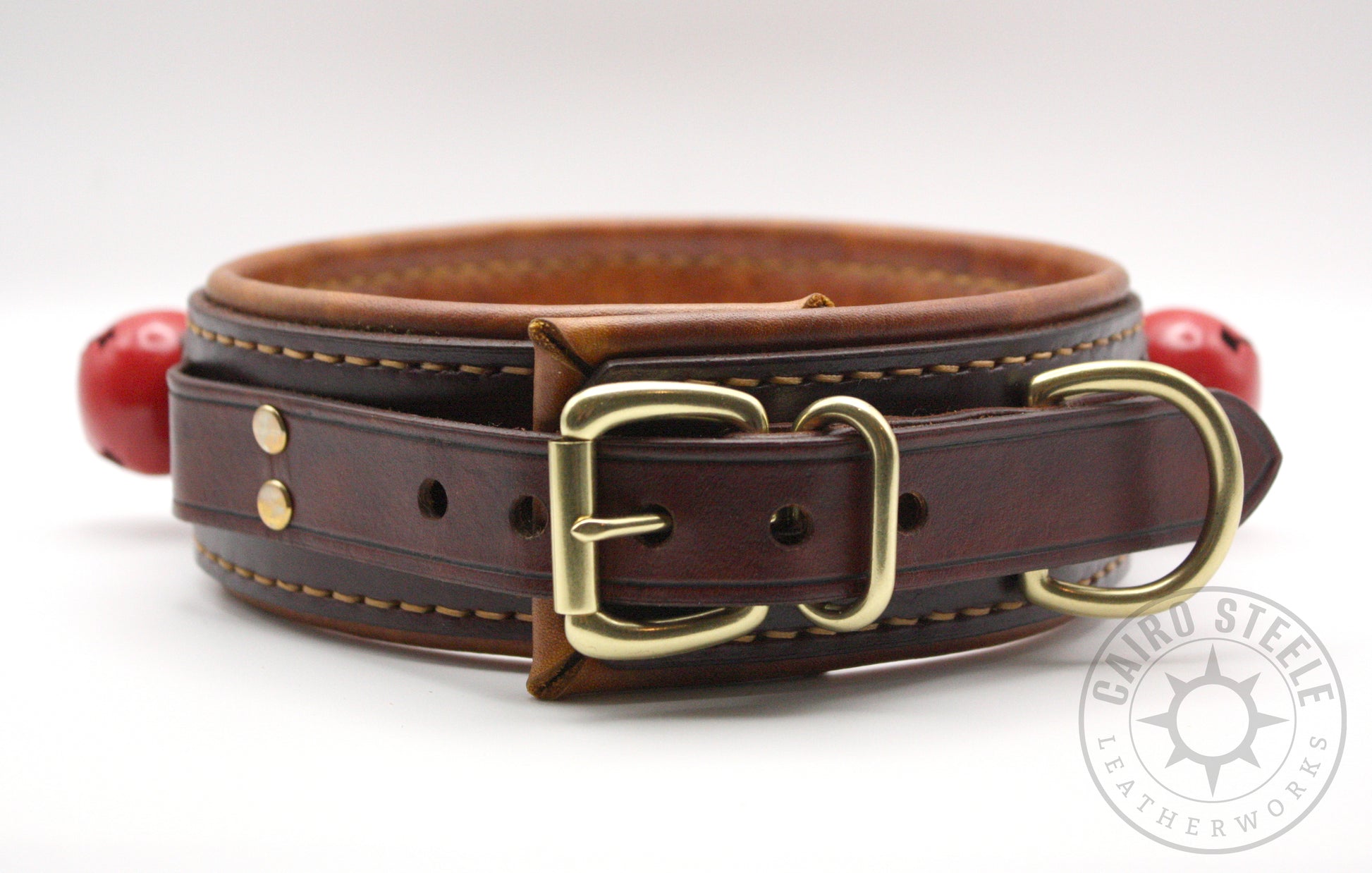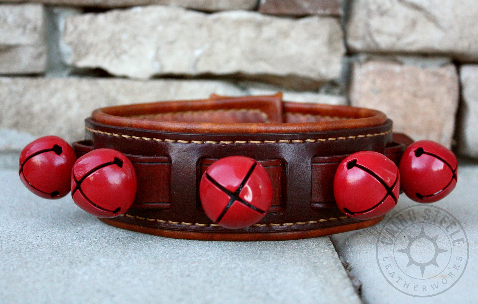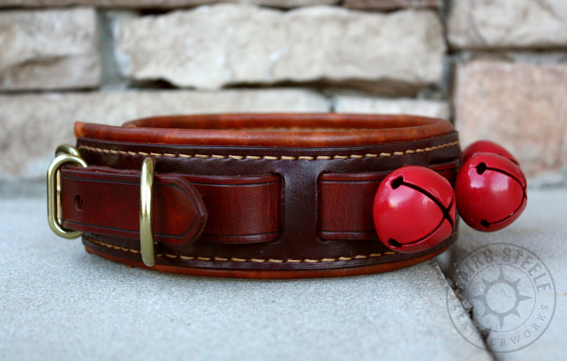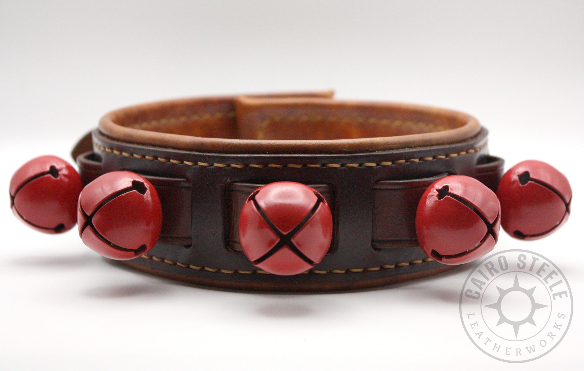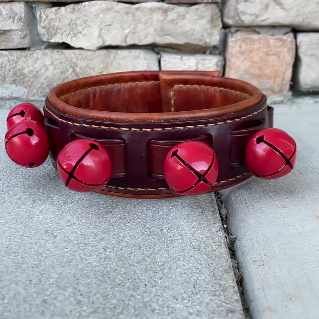 Do you hear those sleigh bells ringing? Jingle bell season is here, and what better way to celebrate than with a festive leather collar! This handmade leather collar has a dark brown body and medium brown liner, with tan stitching. The hardware is solid brass with vibrant red bells.